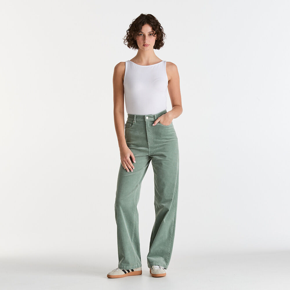 The Hi Wide Leg is designed to flatter and elongate the leg. It sits high and snug on the waist with a dramatic A-line leg silhouette that anchors seamlessly off your hips. Dress up with heels to emphasise the length, or allow to stack over your shoe for a 90's feel. Made in a soft stretch moss green cord fabric.