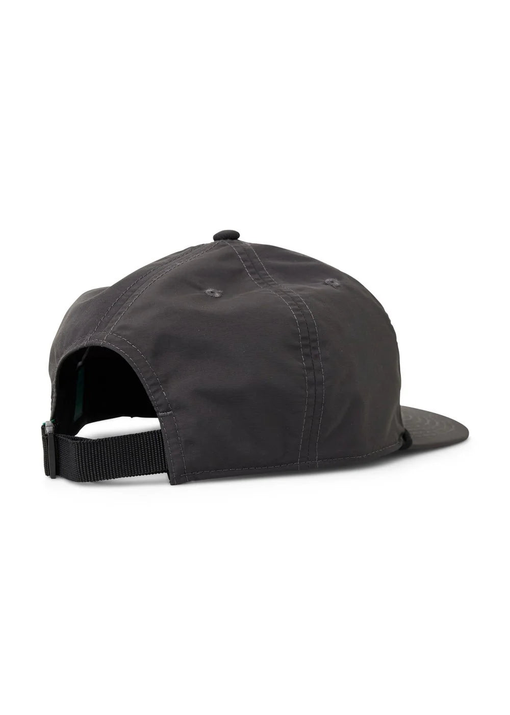 Technical function drives this recycled nylon 5-panel. Sport-mode bungee chin strap and adjustable closure ensure secure fit, enhanced by custom patch detailing.
