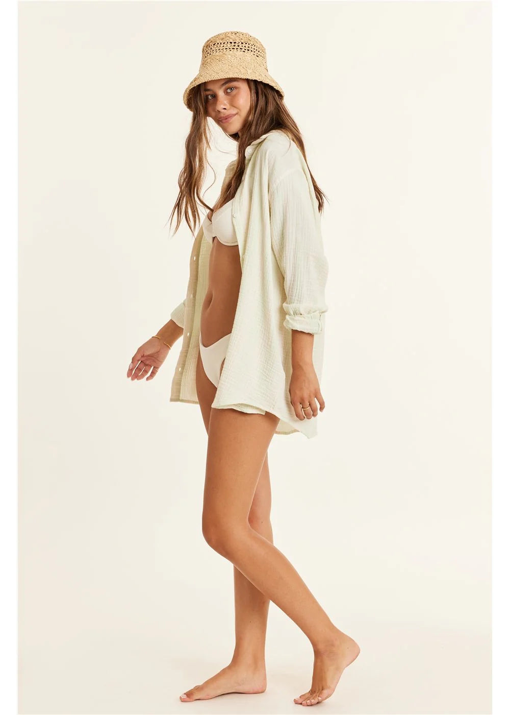 A playful top with button front, long sleeves, and made of soft cotton gauze, perfect for throwing over your kini after a long beach day.