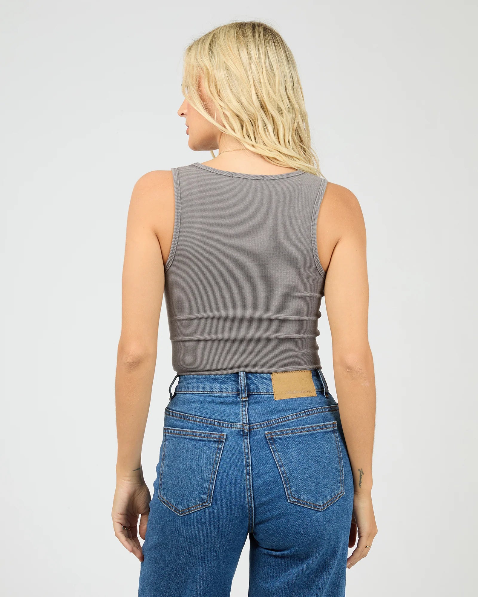The Washed Rib Scoop Neck Tank features a flattering scoop neckline and a soft washed rib fabric in charcoal, offering both comfort and style. Perfect for layering or wearing on its own, it provides a sleek fit that moves with you throughout the day.